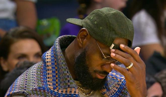 状态不错,詹姆斯身着帅气套装场边观战,期间悠闲地咬着牙线